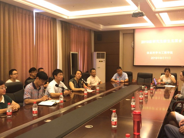 2019年9月11日上午10:30,学院在02507会议室举行2019级研究生师生见面会。学院党委书记江云清、院长谢晓兰教授、副院长陆绮荣教授和硕士生导师代表、研究生辅导员、研究生秘书及全体2019级研究生共80多人参加会议。见面会由学院分管研究生工作的副院长董明刚教授主持。 会上,首先由谢晓兰院长为大家介绍学院基本情况,她勉励同学们要重视做好研究生学业规划,积极参加有关学术会议与学术活动,不断提高自身的科研创新能力。随后,董明刚副院长就研究生毕业基本条件与要求作了介绍,对研究生工作室安排等事项进行了说明,并强调了学习纪律要求。最后,江云清书记进行了总结讲话,并希望2019级研究生牢固树立“四个意识”,即问题意识、创新意识、团队意识和安全意识。 本次新生见面会加深了新生对信息学院的了解,同时也使新生明确了规章、制度与要求。使大家明确了今后学业努力方向,对帮助新生更好成长成才具有积极意义。