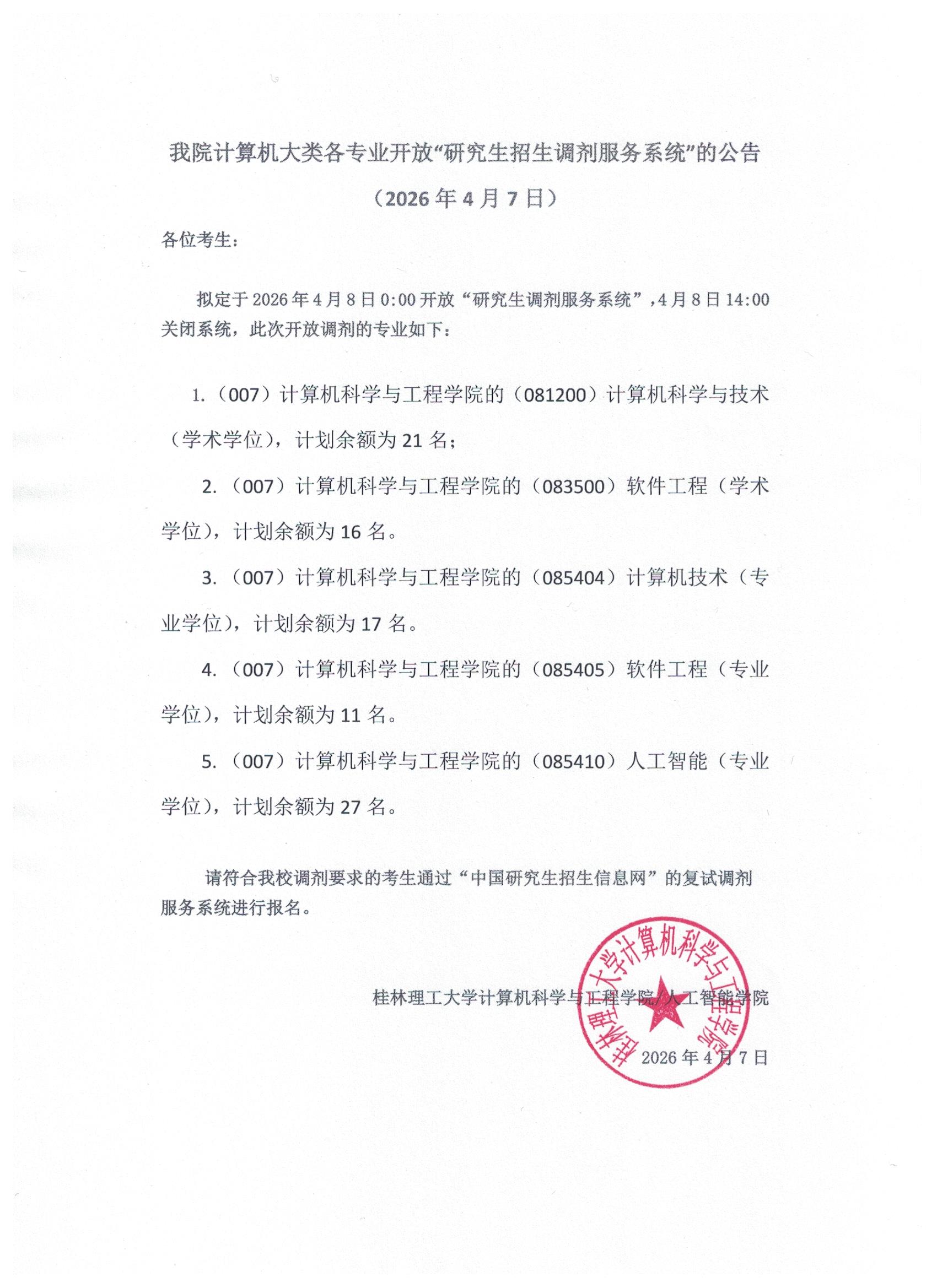 计算机学院2026年硕士研究生招生复试细则 计算机学院081200专业2026年一志愿考生复试录取工作实施细则 计算机学院083500专业2026年一志愿考生复试录取工作实施细则 计算机学院085404专业2026年一志愿考生复试录取工作实施细则 计算机学院085405专业2026年一志愿考生复试录取工作实施细则 计算机学院085410专业2026年一志愿考生复试录取工作实施细则 计算机学院081200专业2026年调剂考生复试录取工作实施细则 计算机学院083500专业2026年调剂考生复试录取工作实施细则 计算机学院085404专业2026年调剂考生复试录取工作实施细则 计算机学院085405专业2026年调剂考生复试录取工作实施细则 计算机学院085410专业2026年调剂考生复试录取工作实施细则 计算机学院2026年硕士研究生复试名单公示 计算机学院2026年硕士研究生拟录取名单公示 计算机学院2026年硕士研究生招生拟录取名单公示(4-12) 计算机学院2026年硕士研究生招生拟录取名单公示(4-15) 我院计算机大类各专业开放"研究生招生调剂服务系统"的公告 我院计算机大类各专业开放研究生招生调剂服务系统的公告(2026-4-7) 我院计算机大类各专业开放研究生招生调剂服务系统的公告(2026-4-12) 我院计算机大类各专业开放研究生招生调剂服务系统的公告(2026-4-15)