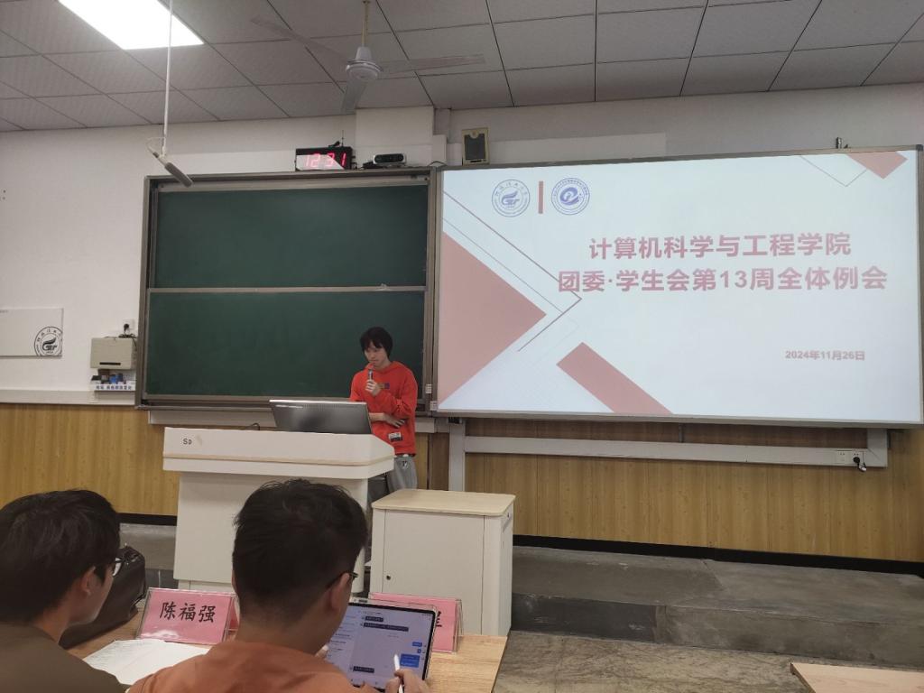 在2024年秋季学期第13周例会上,计算机科学与工程学院团委·学生会各部门总结了上周的工作,并制定了本周的计划。 生活部负责物品准备和租借任务。体育部完成了活动场地清理和学时盖章工作。外联部完成了班服设计大赛的工作,学习部进行班服设计大赛的奖状制作。文艺部完成对新生才艺大赛的收尾工作,并表示将继续协助其他部门工作。 会议明确了各部门的具体任务,各项工作稳步推进,确保团委·学生会各项活动的顺利开展。主席团要求各部门密切配合,强化沟通,确保工作落实。 会议现场 (一审:于钱;二审:蔡志勇;三审:黎超业)