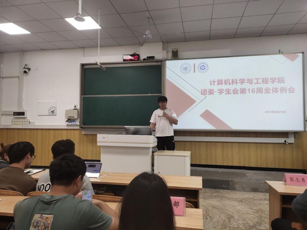 在2025年春季学期第16周例会上,计算机科学与工程学院团委·学生会各部门为接下来要开展的团学代会制定了本周的计划。 学习部负责打印选票并盖章封装完好保证人员进行选票统计;外联部将邀请领导嘉宾出席本次会议,体育部进行活动现场的人员座位布置,生活部准备所需材料的打印以及饮用水、票箱等物品,文艺部进行与主持人的对接,提前熟悉整个活动流程。 各部门在计划中展现了紧密的协作精神,确保学院团学代会工作有序开展。 会议现场 (一审:于钱;二审:蔡志勇;三审:黎超业)