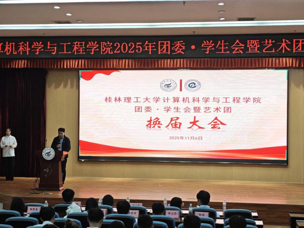 11月6日19:00,学院2025年团委・学生会暨艺术团换届大会在雁山校区图书馆报告厅隆重举行。学院党委副书记黎超业,团委副书记蔡志勇,兼职辅导员苏园颖、马子康、王景艳、游佳斌以及团委・学生会、院艺术团22至25级全体成员齐聚现场,共同见证这一薪火交接的重要时刻。 大会在庄严的国歌声中拉开序幕。学院团委副书记蔡志勇老师率先致辞,他高度肯定了学生组织过往在校园文化营造、学生服务保障等工作中取得的亮眼成果,向默默耕耘的同学们致以诚挚谢意。同时他寄语全体成员,要以饱满热情与务实作风投身学生工作,在服务同学、建设学院的道路上稳步前行。 22级主席团成员杨雯惠代表往届团队作工作总结。她系统梳理了团委・学生会在思想引领、校园活动策划、学生权益服务等领域的突出成绩,直面工作流程衔接、活动创新度不足等问题,并向新一届成员送上恳切寄语,期许大家续写佳绩。随后,各部门依次述职,简明汇报年度成果与未来规划。 换届聘任仪式在全场热烈掌声中开启。学院领导、老师为往届成员颁发聘书,这份荣誉凝结着大家的辛勤付出,更承载着沉甸甸的责任。23级主席团成员于钱作为新一届代表发言,他坚定表态将接好工作接力棒,以更昂扬的姿态砥砺奋进,全力为学院发展贡献青春力量。 学院党委副书记、纪委书记黎超业老师作总结讲话。他高度认可上一届成员的付出,并对新一届团队提出三点要求:一是坚定理想信念,坚守服务同学的初心;二是深耕自我提升,锤炼综合素养;三是勇于突破创新,打造特色工作品牌。一番话语掷地有声,为全体成员指明方向、提振士气。 大会最终在师生合影留念的温馨氛围中落下帷幕。此次换届大会既是对过往工作的复盘总结,更是一次精神传承与思想凝聚。相信新一届学生组织成员定能凝心聚力,推动学院团学工作迈上新台阶,为学院高质量发展注入源源不断的青春动能。