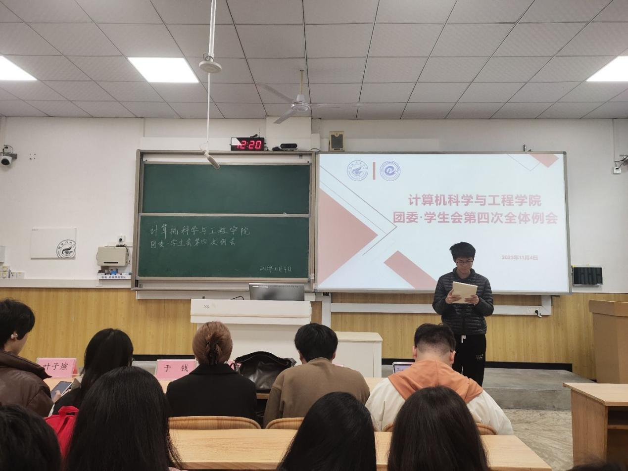 为部署学生会换届大会及荧光夜跑系列活动,11月4日中午,计算机科学与工程学院团委、学生会于06104教室召开秋季学期第九周全体例会,学院团委副书记蔡志勇老师及团委、学生会全体成员参加会议。 会议首先总结了校运会的工作成效,圆满完成各项赛事保障任务,展现出了学院学生组织强大的执行力与凝聚力。本周工作聚焦两大核心任务:一是筹备11月6日晚举行的换届暨述职大会;二是推进荧光夜跑活动,文艺部及时与校学生会对接沟通,确保活动衔接顺畅。 蔡志勇提出必须严格执行例会制度,所有活动发布前必须经过严格审核流程,坚决防止涉及诈骗等非法内容,确保信息发布的安全性与规范性。 本次例会通过总结与部署工作,明确了务实高效的工作要求,确保了换届工作与文体活动的安全有序推进,更奠定了学院团学工作平稳过渡和持续发展的坚实基础。 会议现场 (一审:蔡志勇;二审:孟德;三审:黎超业)
