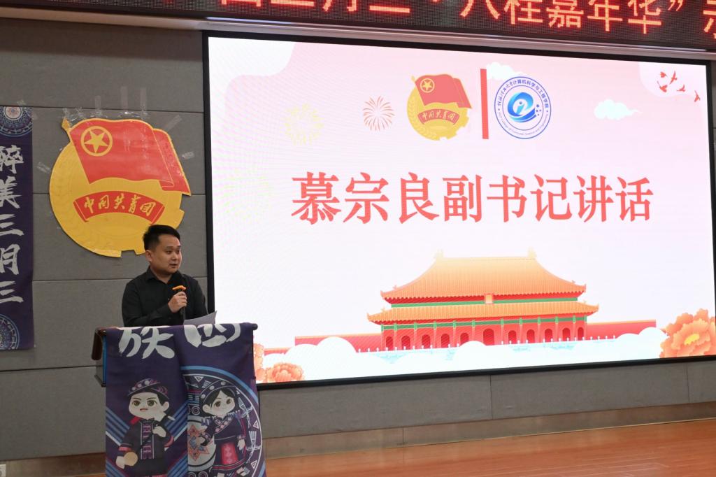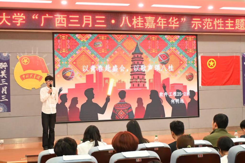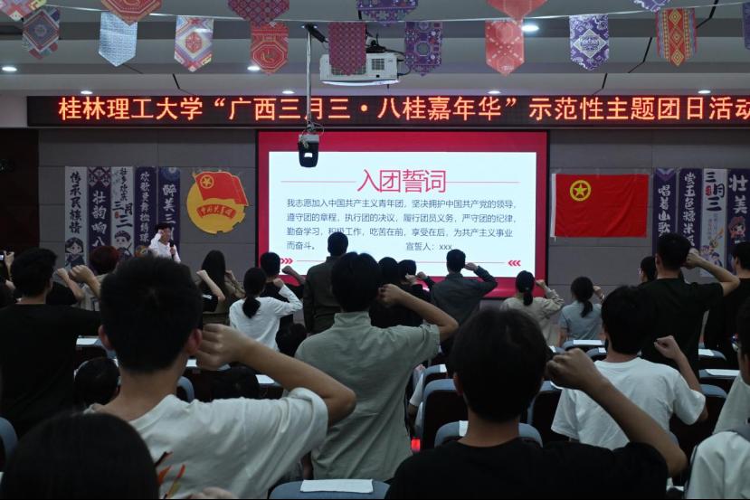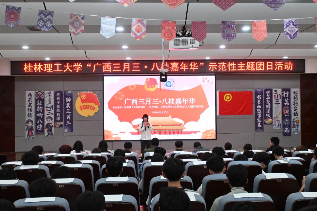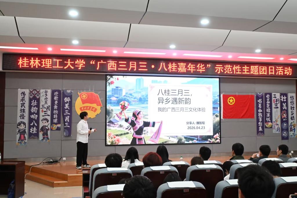 4月23日晚,由校团委主办、学院团委承办的“广西三月三・八桂嘉年华”示范性主题团日活动在雁山校区01501学术报告厅顺利举办。校团委副书记慕宗良,学院党委副书记、纪委书记郝文佳,学校专兼职团干部、辅导员及团员青年代表共同参与本次活动。 本次活动紧扣铸牢中华民族共同体意识主线,在全体齐唱团歌中正式拉开帷幕。活动现场依次开展“我与广西三月三”故事分享、主题朗诵、文化知识问答、民族舞蹈表演、重温入团誓词等环节,内容丰富、形式鲜活。团员代表何明远、魏智程先后结合亲身经历,分享与广西三月三的故事及文化感悟;主题朗诵《八桂飞歌,情满三月三》深情展现八桂大地民族风情与文化魅力;广西三月三文化知识问答环节以互动抢答的形式,让团员青年在趣味参与中加深对三月三民俗、历史与文化的认知;壮族特色舞蹈《敬酒歌》灵动演绎,让大家沉浸式感受壮族文化的独特韵味。随后,全体团员庄严重温入团誓词,铭记入团初心、坚定理想信念。 慕宗良作总结讲话。他寄语广大团员青年,要深入学习广西多民族交融共生的文化底蕴,不断增强对中华文化的认同感、归属感与自豪感,自觉铸牢中华民族共同体意识,以青春活力传承弘扬八桂优秀传统文化,主动担当时代使命,为广西铸牢中华民族共同体意识示范区建设与学校高质量发展贡献青春力量。 本次示范性主题团日活动,以青年喜闻乐见的形式将民族文化教育与思想引领有机结合,有效引导团员青年感悟“三月三”节庆文化内涵。下一步,学院将持续创新青年思想政治引领载体,深耕民族文化传承教育,引导广大团员青年在感受民族文化魅力中激扬青春风采,以实际行动助力地方发展与学校“十五五”建设。